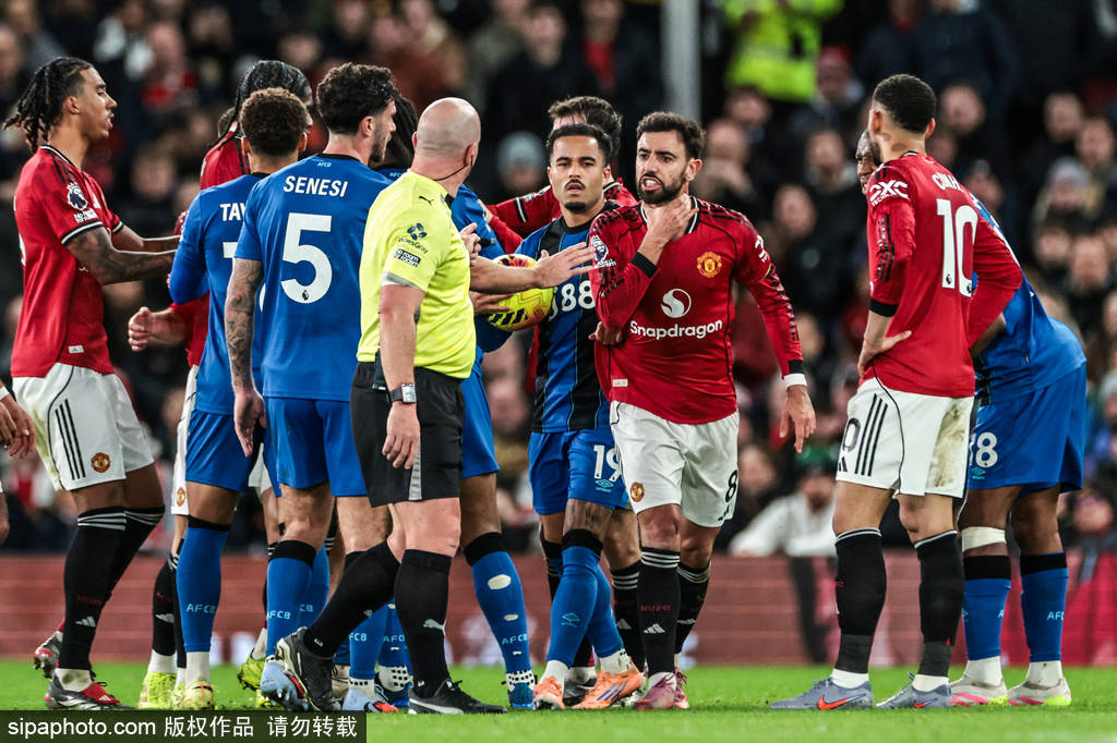 第44分钟,塞梅尼奥与达洛特在争顶时发生冲突。塞梅尼奥高高跃起后,达洛特在后面碰了一下他的腰部,导致后者摔倒在地。随后,塞梅尼奥立马起身向达洛特走去,“报复性”地锁喉达洛特,引发了双方球员的冲突,裁判选择各打五十大板,向达洛特和塞梅尼奥各出示一张黄牌。上半场补时阶段,曼联的任意球进攻,伯恩茅斯球员在禁区内起跳防守时有明显的手球行为,但裁判没有给点球,而是判罚了角球。